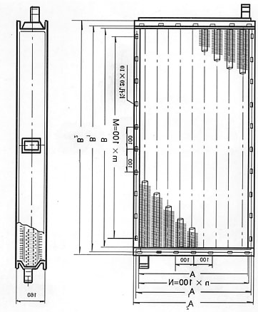 ◇ SRZ型散热器主要由顺向的三排叉排列螺旋翅片管束组成,其翅片管均用¢25×2mm无缝钢管绕制上12.5×0.4mm的皱折钢带而成。